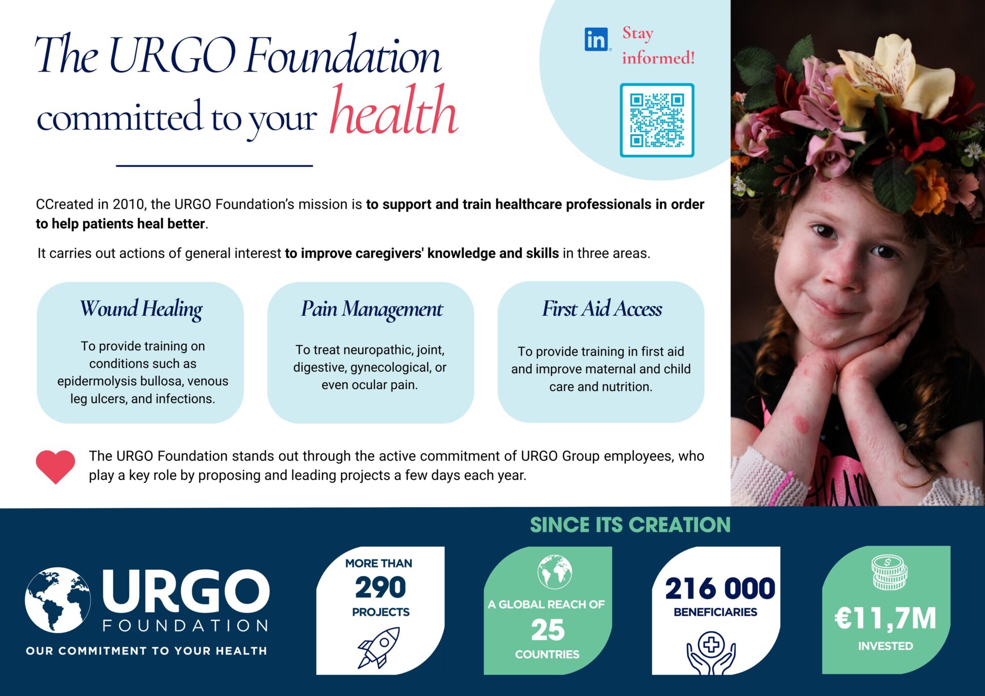 At URGO, we are committed on a daily basis to changing patients’ lives thanks to our innovations. We are experts in healing and treatment. Creating the URGO Corporate Foundation in 2010 was an obvious step for Hervé Le Lous, Founder of the URGO Group. It has a global outlook with more than 290 projects carried out since 2010 in 25 countries around a key focus: training healthcare professionals in better caring for patients.